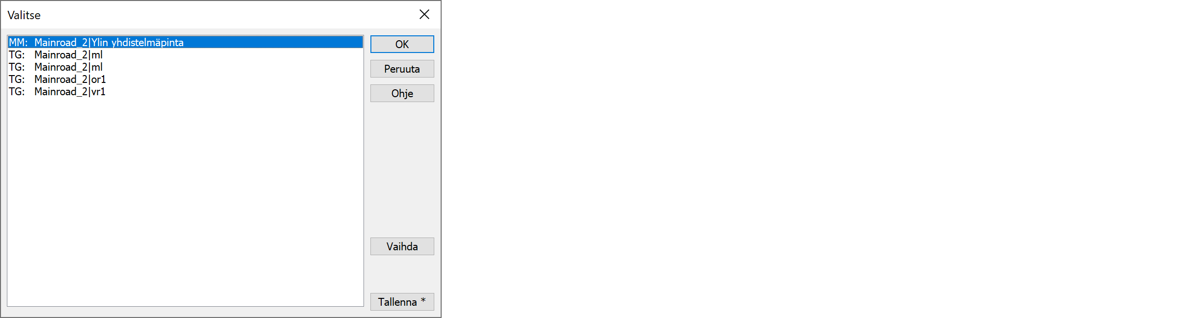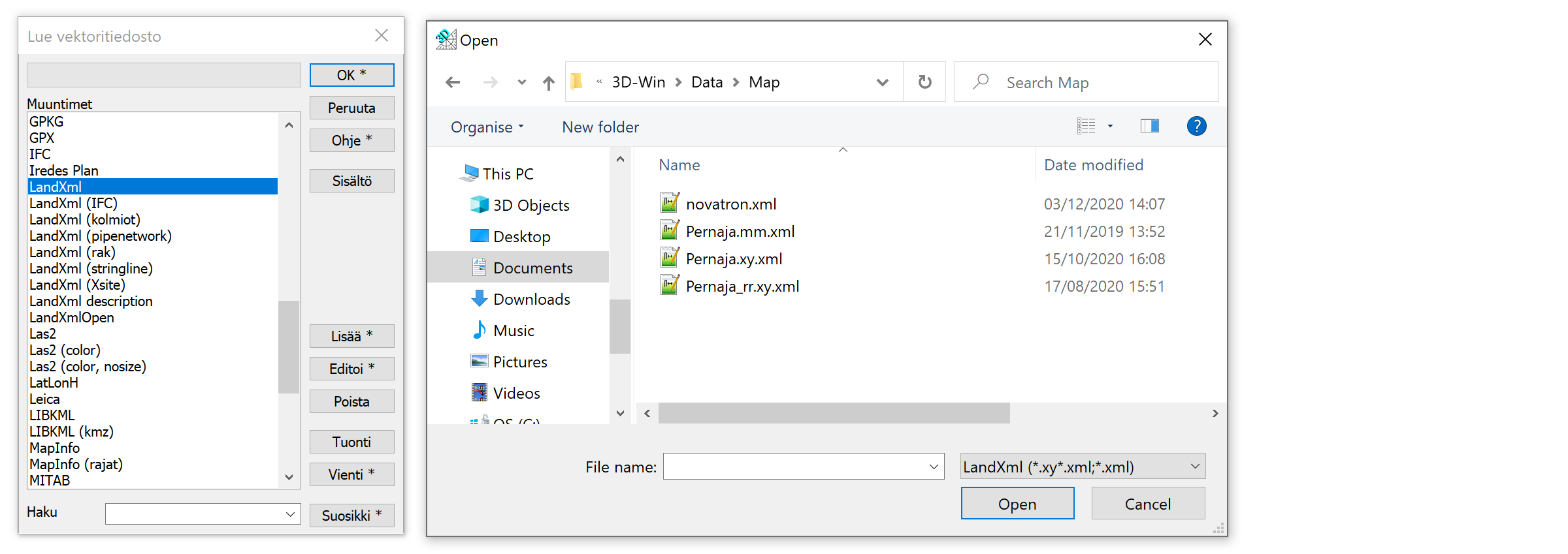 Erillisenä toimintona tiedostovalikosta löytyy toiminto Avaa LandXML. Se kysyy avattavan LandXML tiedoston ja näyttää sen sisällä olevat osiot tyyppeineen. Tuettuja tyyppejä ovat vektoritiedosto (XY), maastomalli (MM) ja tiegeometria (TG). Lisäksi vektoritiedostoilla voi olla omia erityistyyppejään (pipe network, plan features).