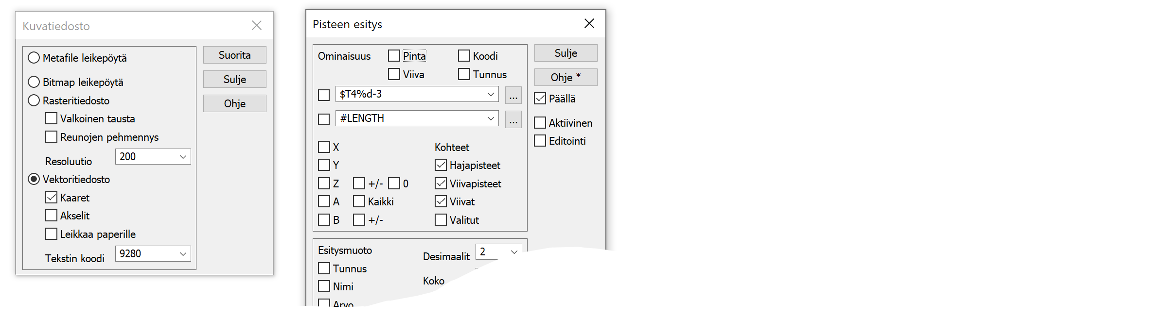 Normaali kirjoitus kirjoittaa vain tiedostossa olevan datan. CAD-ohjelmiin halutaan usein kirjoittaa näytöllä näkyvä kuva. Tämä tapahtuu valikon toiminnolla Tiedosto / Kuvatiedosto. Tällöin kuvan mittakaava määräytyy tulostusmittakaavan mukaan ja kuvaan kirjoitetaan myös pisteiden ja viivojen vierelle kirjoitetut ominaisuudet (valikossa Asetukset / Pisteen esitys).