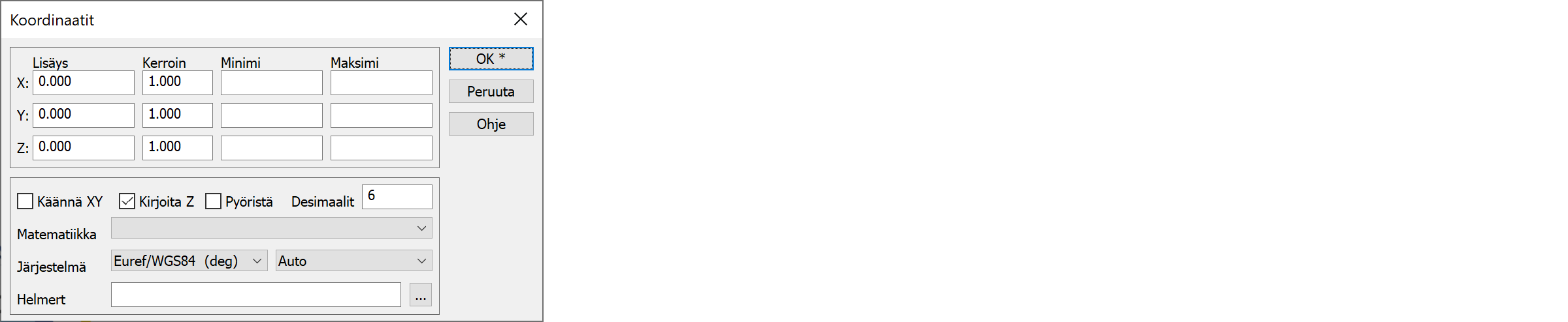 Koordinaattiasetukset (XYZ)
