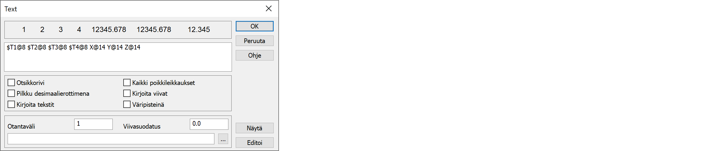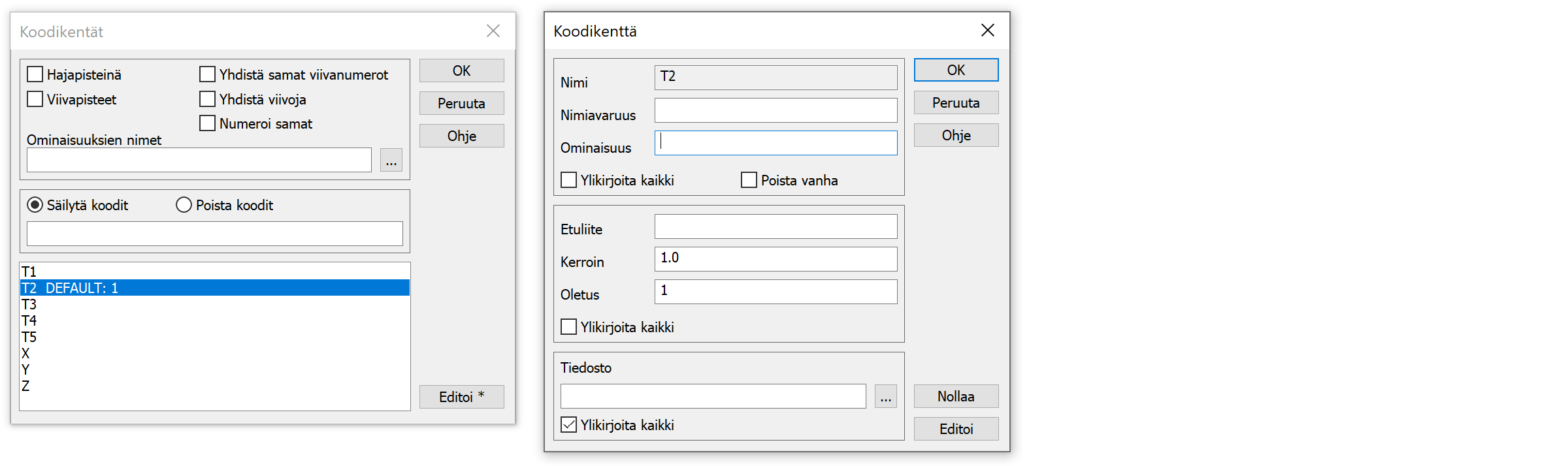Kohdassa Oletus annetaan oletusarvo tyhjille arvoilla. Ylikirjoita kaikki -rasti pakottaa oletusarvon kaikille. Viivanumeron (T2) ja pistenumeron (T4) kanssa oletusarvo on uudelleen numeroinnin alkuarvo. Esimerkiksi kentän T2 oletusarvo 1, numeroi viivat uudelleen alkaen numerosta 1. Tätä tarvitaan usein formaateissa, jotka vaativat yksilöllisen viivanumeron.