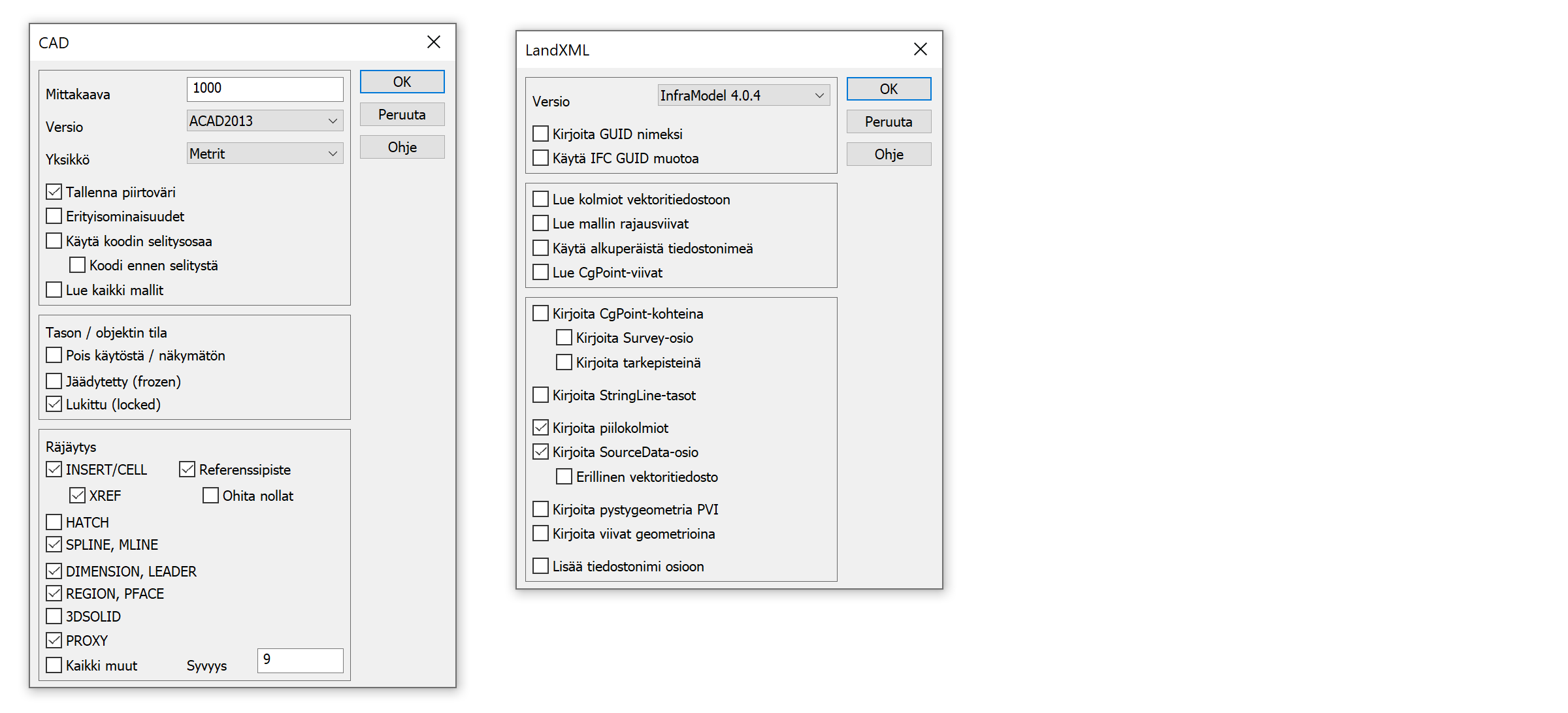 Yleisiä formaatteja: LandXML, DXF
