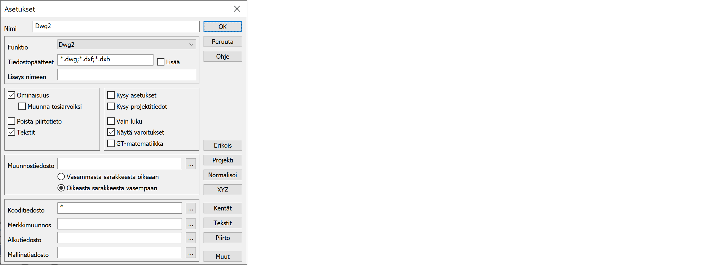 Kullakin formaatilla voi olla omia muunninkohtaisia asetuksia. Nämä löytyvät asetusten alanurkan Muut-painikkeen takaa. Osa asetuksista vaikuttaa vain lukuun ja osa vain kirjoitukseen. Erityisesti DWG ja LandXML formaatit tarvitsevat näitä usein.