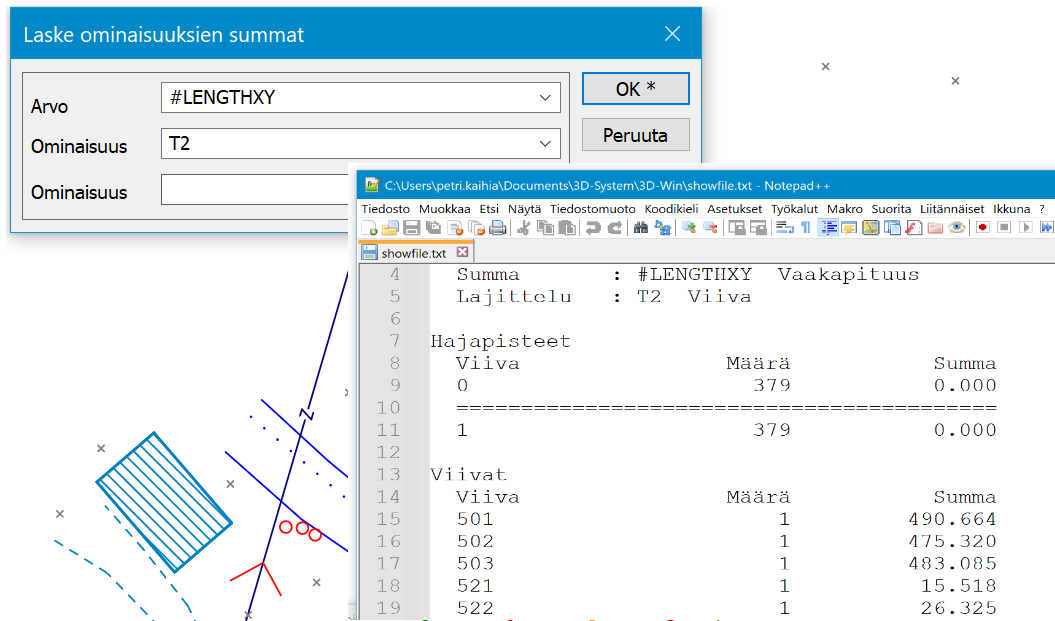 Laskee annetun ominaisuuden summat sekä hajapisteiltä että viivoilta.