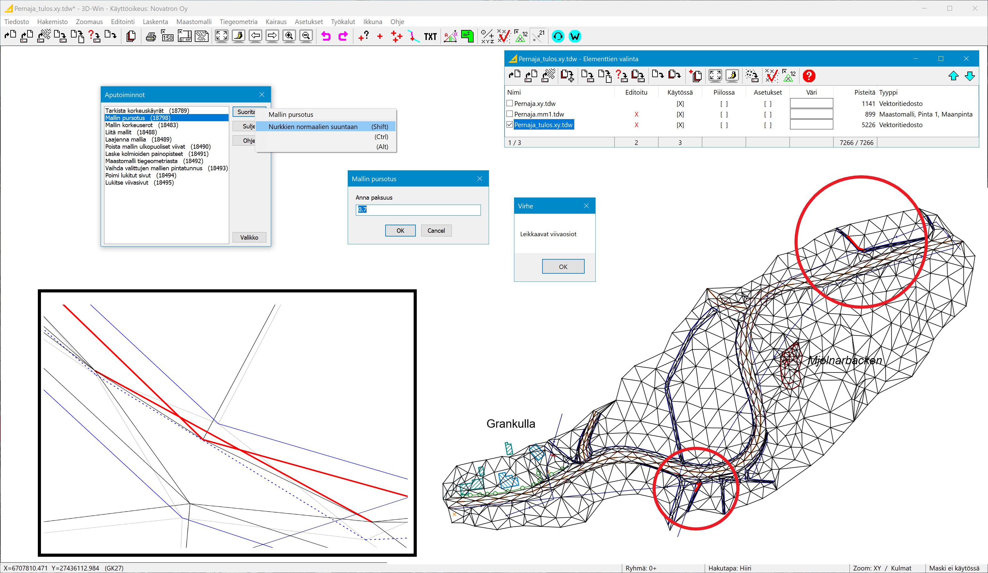 Mallin pursotus normaalien suuntaan maalaa tulostiedoston risteävät kolmiot punaisella.