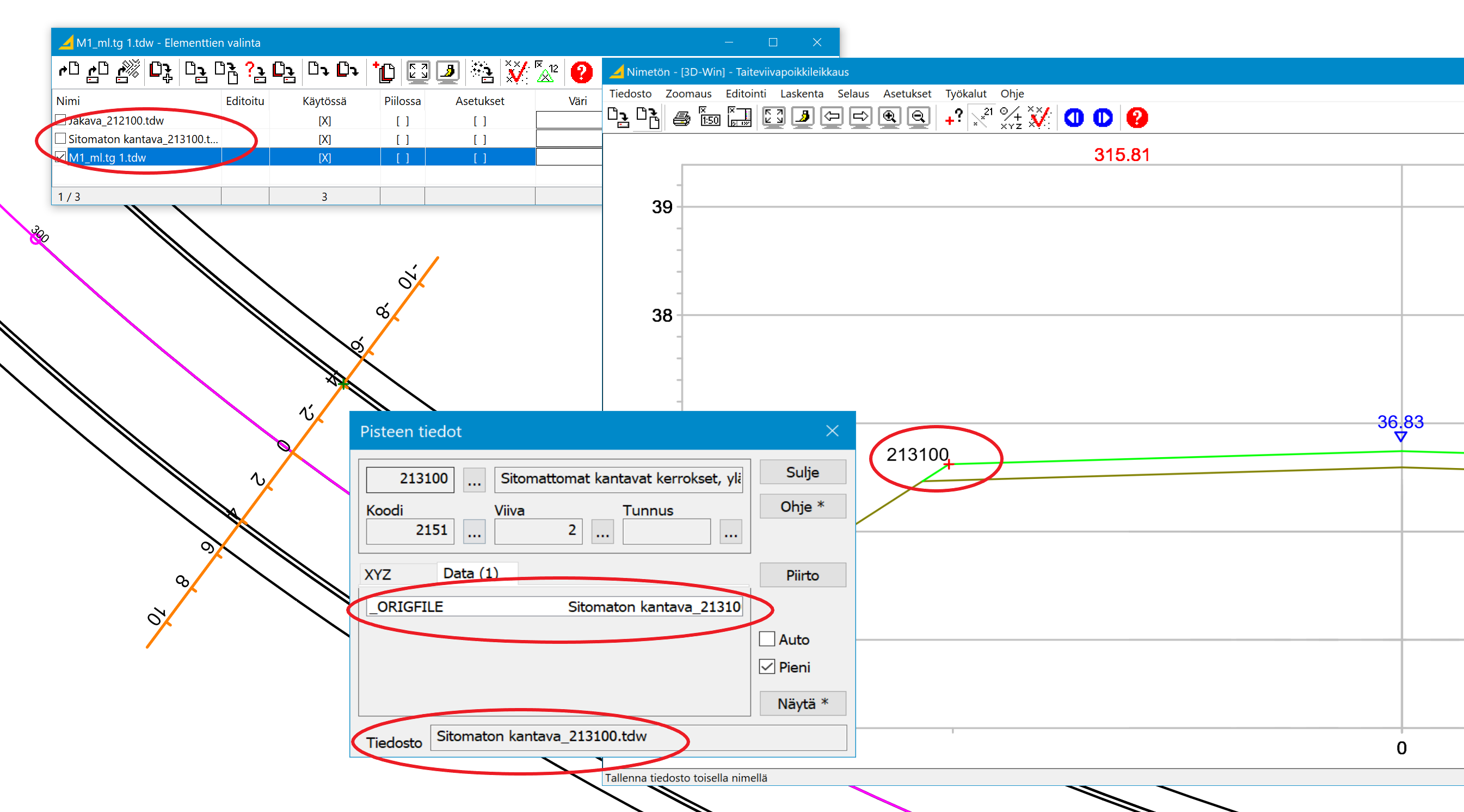Editointi - Pisteet - Tiedot näyttää Data-lehdellä ominaisuutena _ORIGFILE pääikkunassa olevan tiedoston nimen.