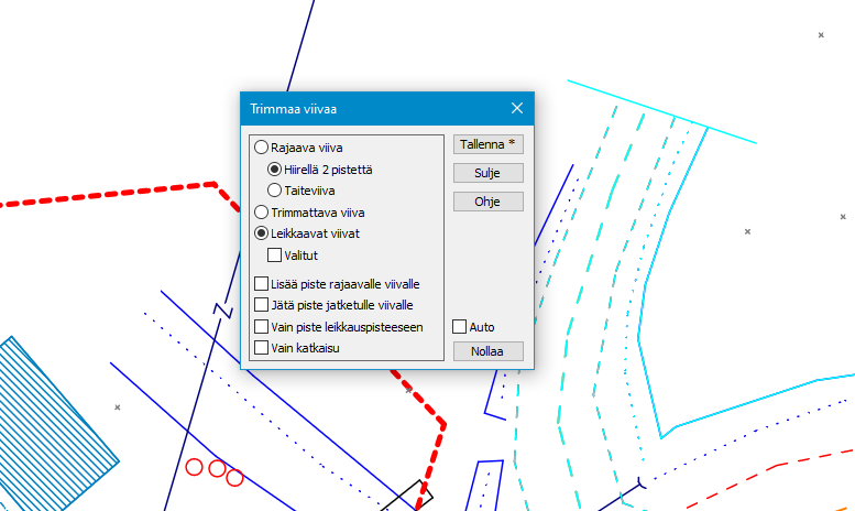 Lisätty kaikkien tai valittujen leikkaavien viivojen trimmaus/jatko kerralla.