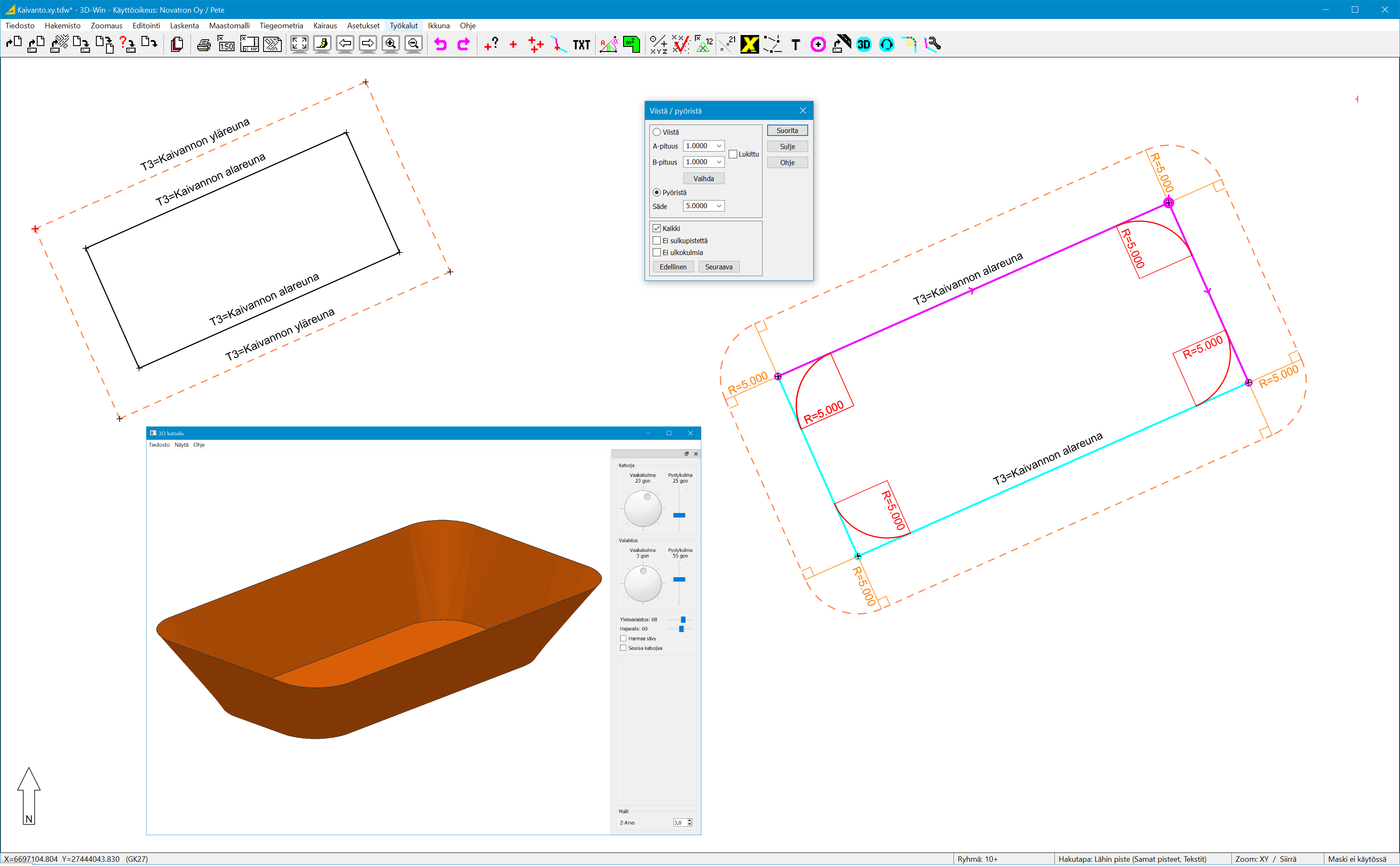 Viistää kulmia annetuilla etäisyyksillä tai pyöristää annetulla säteellä.