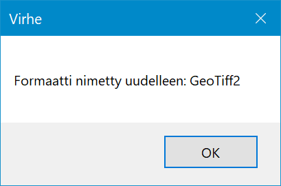 Versiosta 2023.2 alkaen Geotiff, GeoJson, GPKG ja JP2 -formaatit löytyvät oletuksena Muuntimet -listauksesta ohjelman ensiasennuksessa. Ohjelmaversion päivityksen yhteydessä käyttäjähakemistoa ei ylikirjoiteta, jonka vuoksi muuntimet tulee lisätä erikseen Tuonti -toiminnolla.