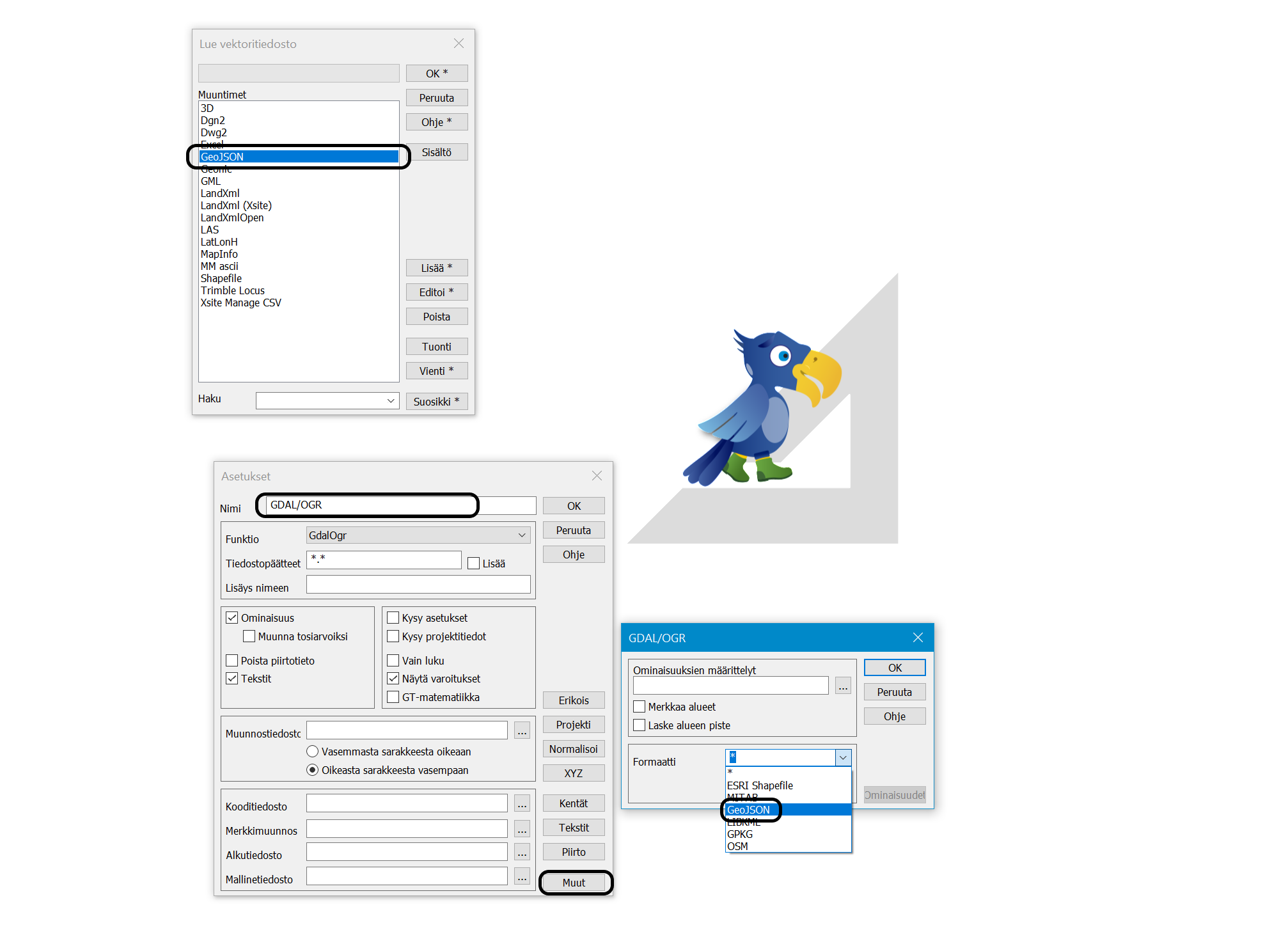 Vektoritiedostojen lukuun GeoJSON ja GPKG Maanmittauslaitoksen aineistoja varten.