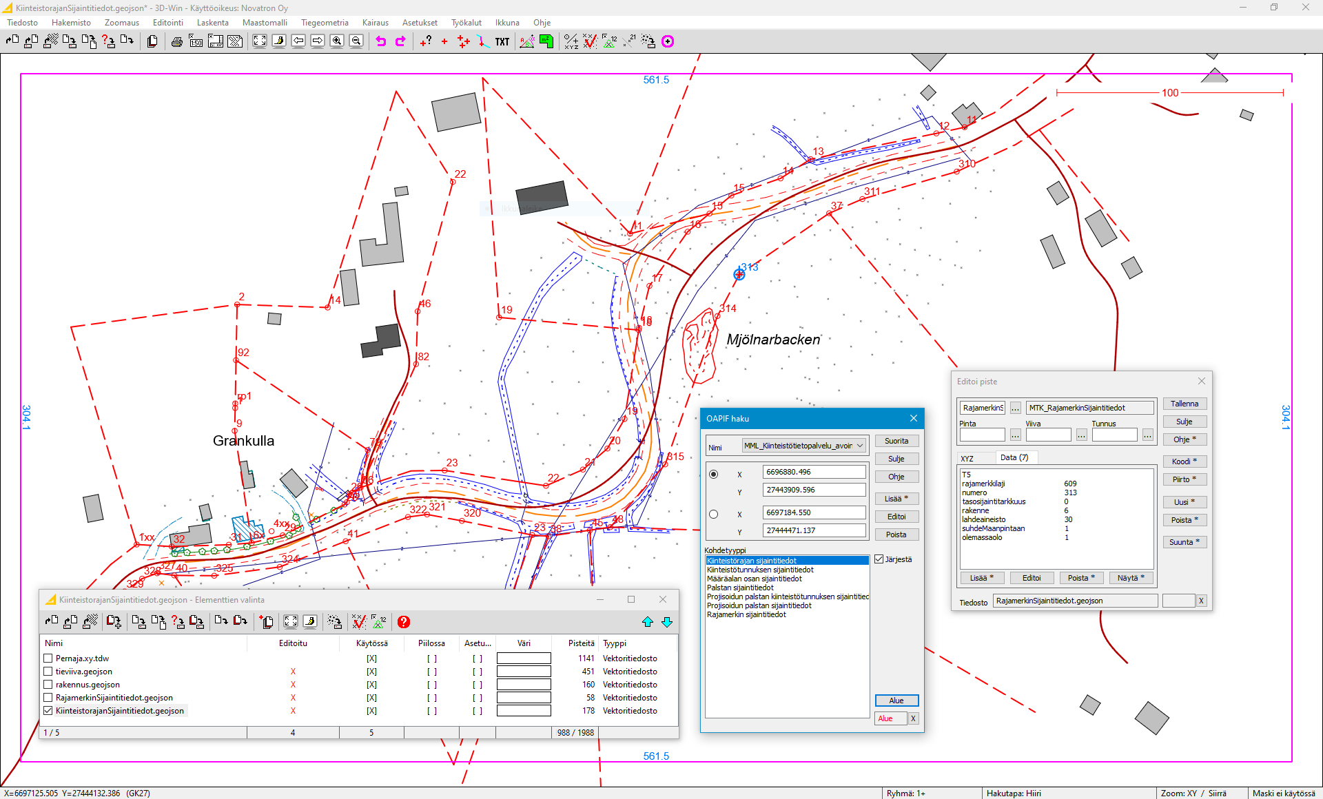 3D-Win versiossa 2023.0 on lisätty oletuksena OAPIF-hakuun Maanmittauslaitoksen tuottama Maastotietokannan kyselypalvelu osoitetietoineen.