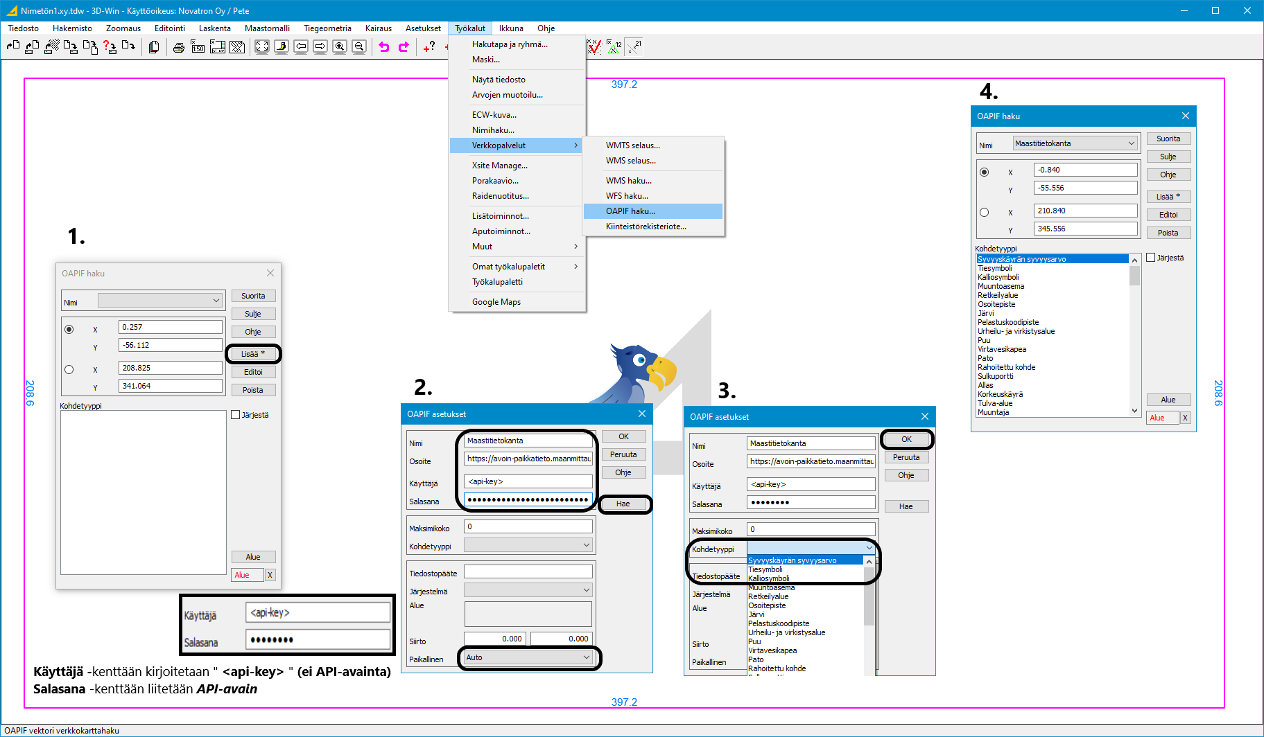 3D-Winin verkkopalveluihin on lisätty versiosta 2023.0 alkaen OAPIF haku -toiminto, jolla voidaan hakea Maanmittauslaitoksen (MML) tuottamia OGC API Features -rajapinnan palveluita. Maastotietokannan, Nimistön, Rakennusten ja Kiinteistötietojen (avoin, ei sopimusta) kyselypalvelun käyttö edellyttää API-avainta (aktivointiohje myöhemmin tässä artikkelissa).