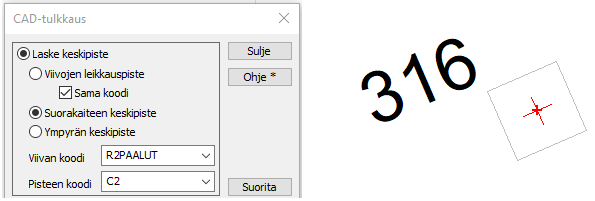 CAD-kuvasta puuttuu usein paalun keskipisteessä oleva hajapiste. Voimme laskea keskipisteen toiminnolla Editointi/Muut/CAD-tulkkaus. Jos käsiteltävät paalut/viivat ovat tietyllä koodilla, vaoidaan laskenta rajoittaa vain näihin viivoihin käyttäen Viivan koodi -asetusta. Pisteen koodiksi kannattaa antaa koodi, jota ei aineistossa muuten esiinny, jolloin pisteet on helppo poimia myöhemmin.