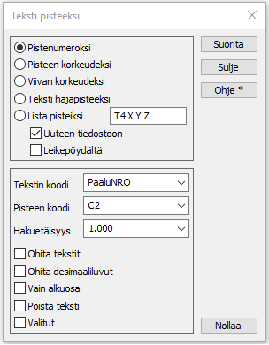 Toiminnolla Editointi/Tekstit/Teksti pisteeksi siirretään teksti pisteen numeroksi. Toiminto käy läpi tekstit, joilla on annettu koodi (Tekstin koodi), ja hakee sitä lähinnä olevan pisteen, jolla on Pisteen koodi. Hakuetäisyys määrää, miten kaukana ne voivat olla toisistaan. Jos annat liian suuren arvon, voi teksti yhdistyä väärään pisteeseen. Liian pieni arvo estää lähimmän pisteen löytymisen. Tekstit ovat suunnittelijan laittamia ja ihmissilmä osaa yhdistää oikein tekstin ja pisteen pienellä päättelyllä, mutta tietokoneelle tämä on haastavampi tehtävä. Esimerkiksi etäisyydet tekstin ja pisteen välillä saattavat vaihdella CAD-kuvan eri osissa. Tekstit voivat olla paikoitettuja eri tavalla, mutta toiminto käyttää hakemiseen aina tekstiä ympäröivän suorakaiteen keskipistettä. Näin yksittäisen tekstin paikoituspiste ei vaikuta hakemiseen. Ennen numerointia kannattaa pisteiltä poistaa mahdollinen vanha/väärä pistenumero. Puuttuvat pistenumerot on näin helpompi hakea jälkikäteen ja lisätä vaikka käsin.