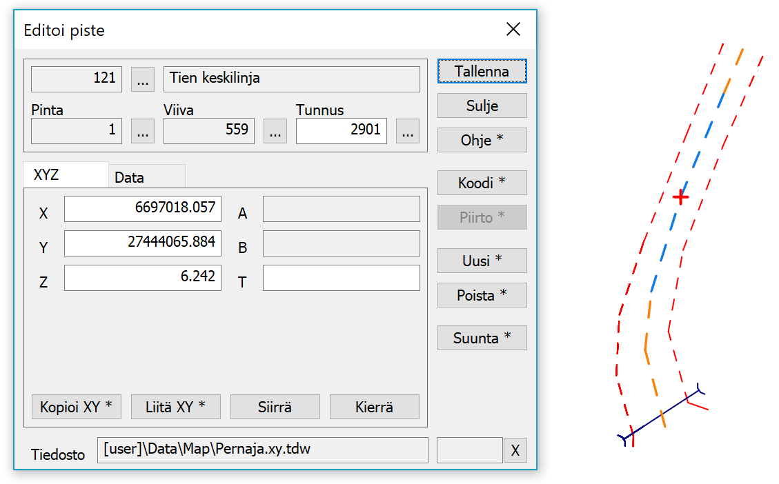 Toiminnon alareunassa näkyy normaalisti editoitavan pisteen tiedosto. Kun uusi piste luodaan, tiedostokenttä tyhjenee, koska piste ei ole vielä missään tiedostossa. Uusi piste tallentuu elementtilistan aktiiviseen tiedostoon.