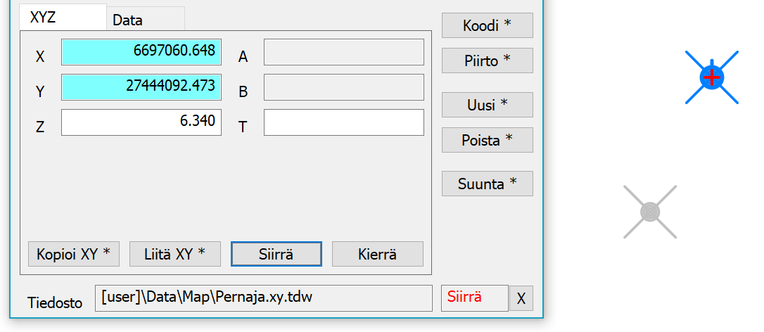 Siirto-painikkeella käynnistetään pisteen siirtotila. Koordinaattikentät maalataan sinisiksi ja seuraavat paikan osoitukset hiirellä siirtävät editoitavaa pistettä. Koordinaattien käsittely riippuu käytettävästä hakutavasta. Hakutavoilla Hiiri ja Hiiri XY ainoastaan pisteen XY-koordinaatit muuttuvat. Hakutavalla Lähin piste myös Z-koordinaatti muuttuu ja sen kenttä maalataan siniseksi. Siirto voidaan myös antaa editoimalla koordinaatteja manuaalisesti. Siirron aikana alkuperäinen piste näkyy harmaana.