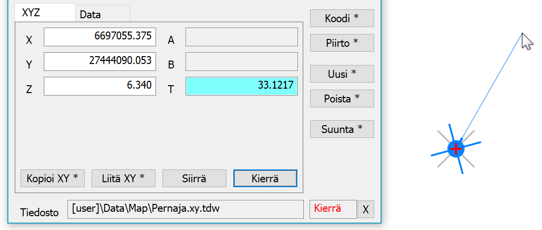 Pisteen kierto tehdään vastaavasti Kierto-painikkeella. Kiertotilassa suuntakulmakenttä T maalataan siniseksi ja piirretään katkoviiva kierrettävästä pisteestä hiirellä osoitettuun sijaintiin. T-kenttään voidaan suunta syöttää myös manuaalisesti. Kierto kuitataan hyväksytyksi tallentamalla piste tai hylätään painamalla Kierto- tai X-painiketta. Toinen tapa kiertää pistettä on Suunta-painike. Se pyörittää pisteen symbolin suuntaa oletuksena 50 goonin välein myötäpäivään. Shift-näppäimen kanssa pyöritetään suuntaa vastapäivään ja Ctrl-näppäimen kanssa käytetään 10 goonin askelta.