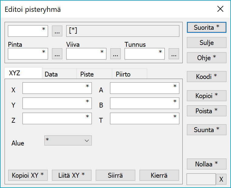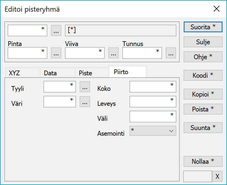 Pisteryhmän editoinnilla voidaan muuttaa ryhmään valittujen kohteiden koordinaatteja ja ominaisuuksia. Toiminto voidaan avata myös pikanäppäimellä Ctrl-G. Kenttiin annetaan halutut arvot ja painetaan Suorita-painiketta, jolloin arvot tallentuvat kohteille. Painikkeen pikavalikossa olevalla Tyhjennä-toiminnolla voidaan ryhmä tyhjentää automaattisesti suorittamisen jälkeen. Tähti kentässä tarkoittaa, että sitä arvoa ei muuteta.