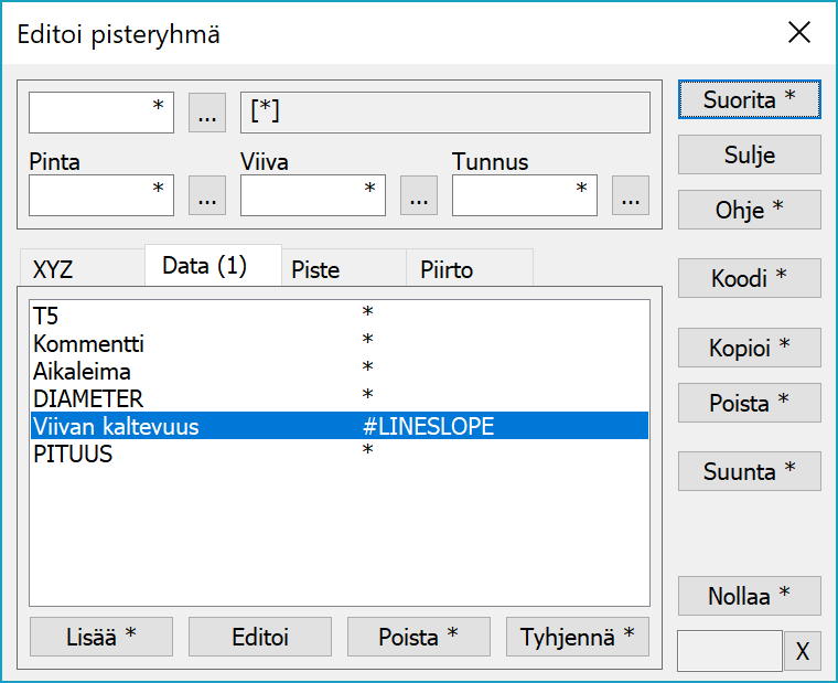 Pisteryhmän ominaisuustietoja muutetaan Data- ja Piste-välilehdillä. Molemmissa on lista, johon voidaan lisätä usein käytettyjä ominaisuuksia. Kaikkien ominaisuuksien arvot ovat oletuksena tähtiä eli niitä ei muuteta. Jos jollekin ominaisuudelle annetaan arvo ja suoritetaan toiminto, arvo tallentuu ryhmässä olevalle kohteelle. Kohteiden valinta riippuu käytetystä välilehdestä. Data-välilehdellä olevat ominaisuudet tallennetaan ryhmässä oleville hajapisteille ja viivoille. Viivan katsotaan olevan ryhmässä, jos yksikin sen piste on ryhmässä. Piste-välilehdellä olevat ominaisuudet puolestaan tallentuvat hajapisteille ja viivan pisteille. Tällöin kunkin viivapisteen kuuluminen ryhmään tarkistetaan erikseen.
