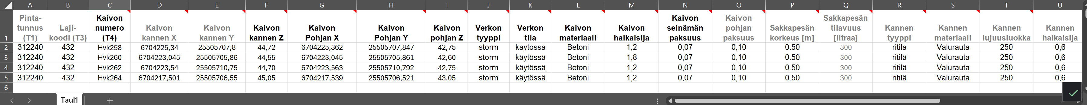 Löytyy ainoastaan Pinta, Viiva, Koodi, Tunnus sekä X,Y,Z-koordinaatit kaivon pohjalle sekä putkien viivan pisteille esimerkkinä