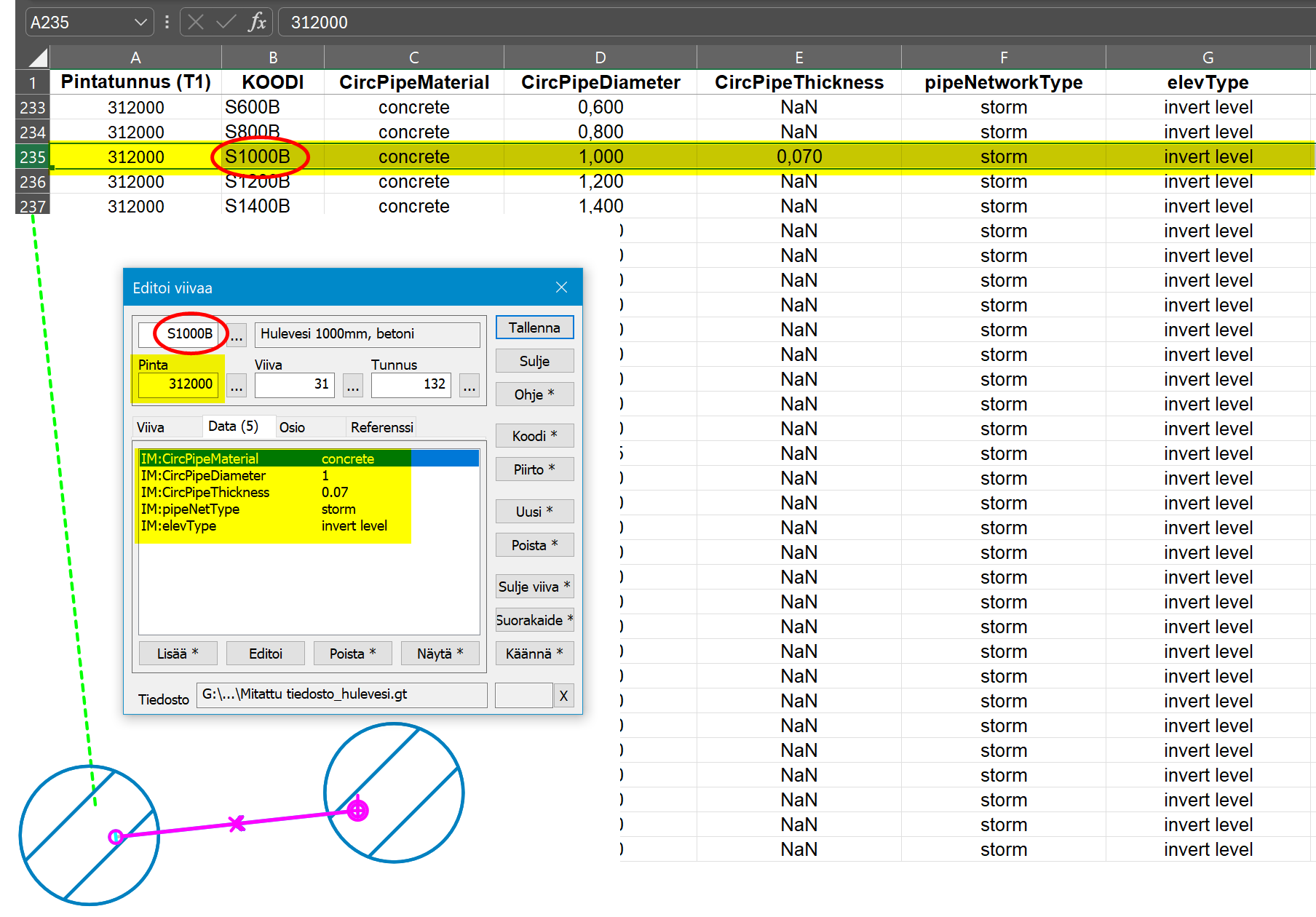 Esimerkki 1 (mittaustiedostossa putket ja kaivot, ominaisuudet luetaan excel-taulukoista)