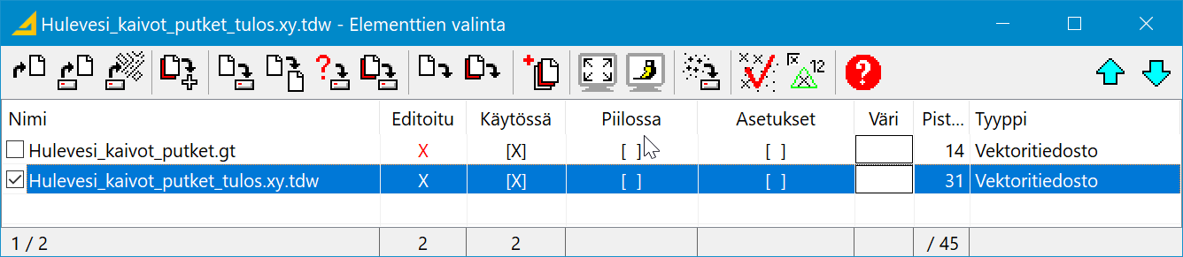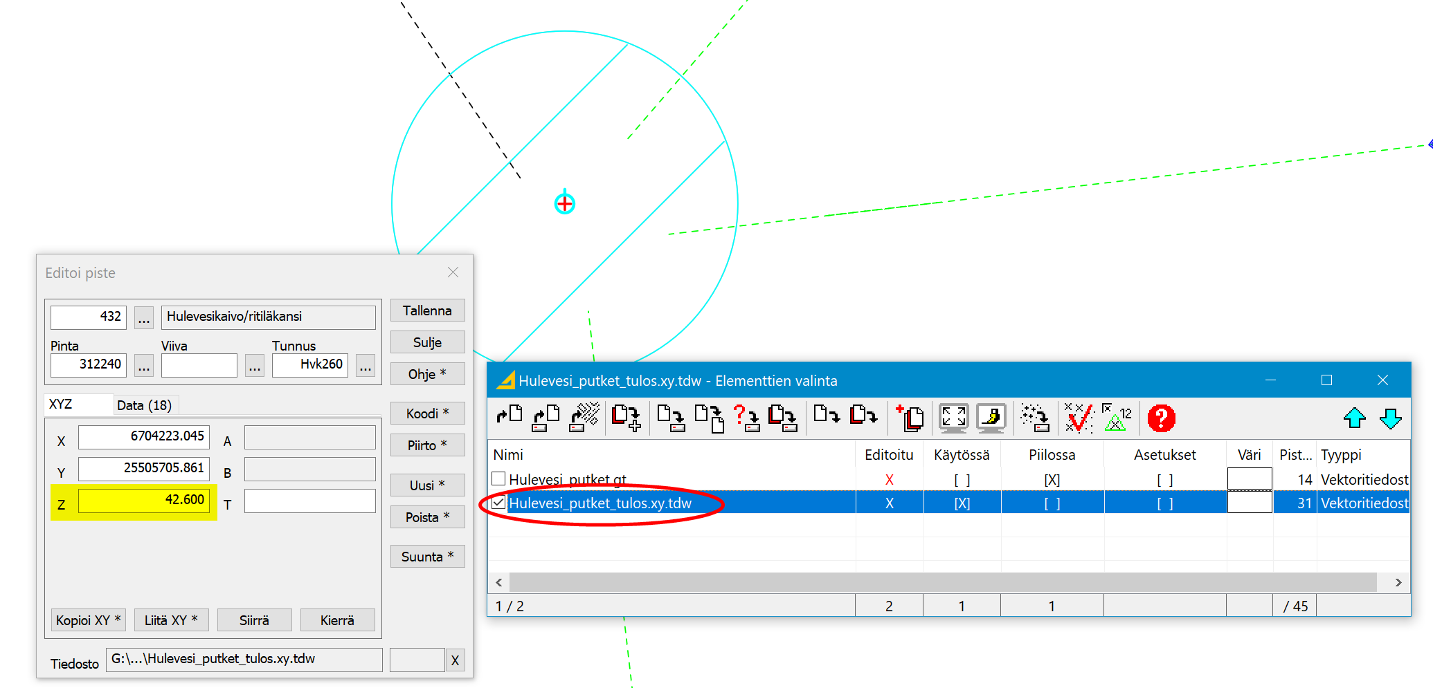 Elementtilistaan tulee Hulevesi_kaivot_putket_tulos.xy.tdw