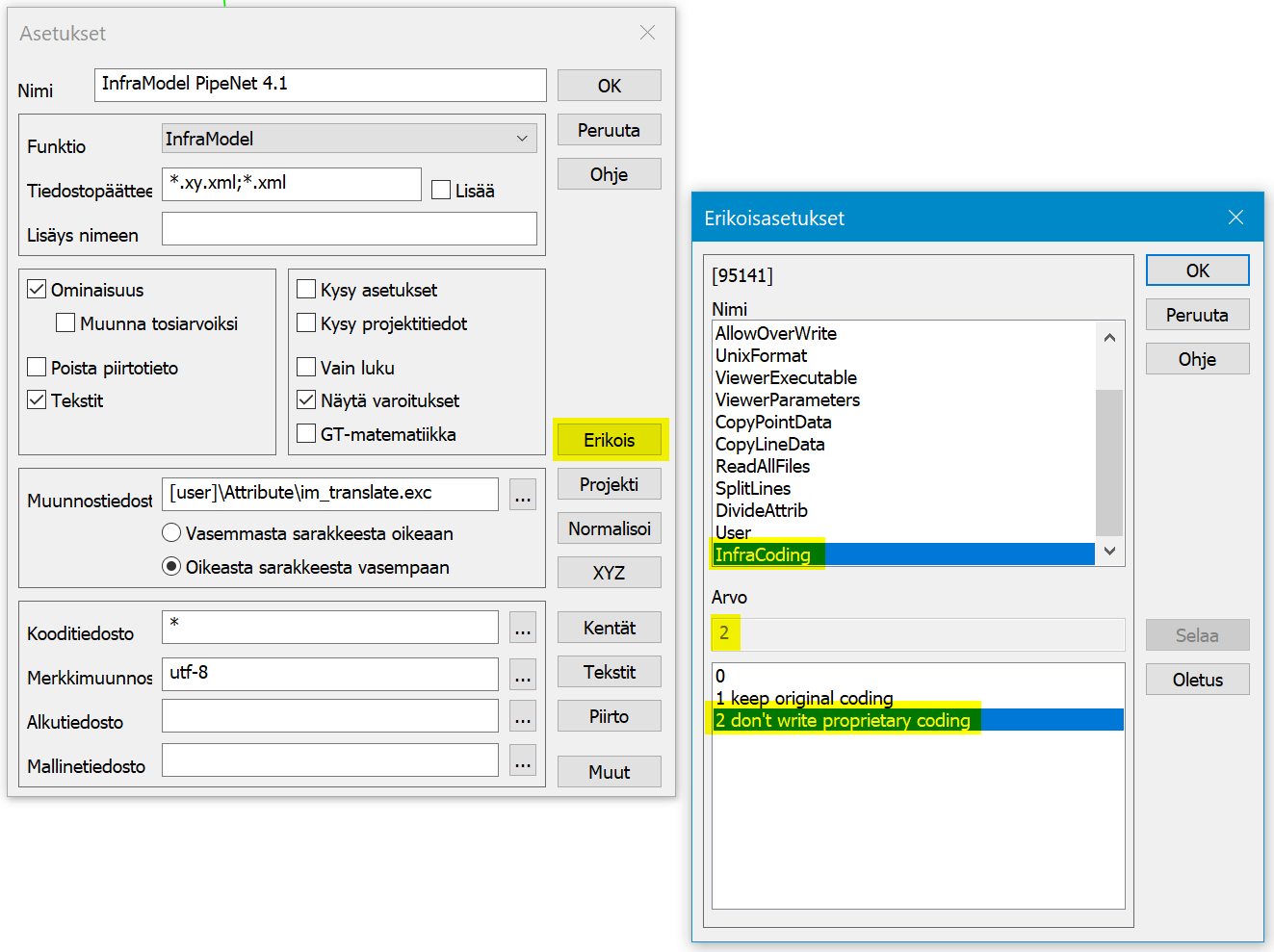 InfraModel PipeNet 4.1 kirjoitusmuuntimessa on oletuksena määritelty Erikoisasetuksissa → InfraCoding