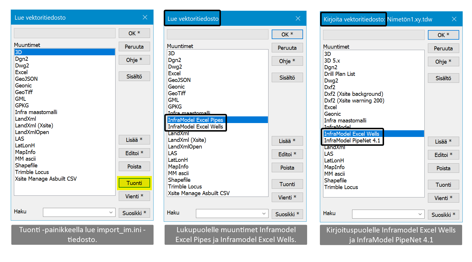 Muunninlistaan kirjoituspuolelle Inframodel Excel Wells ja InfraModel PipeNet 4.1