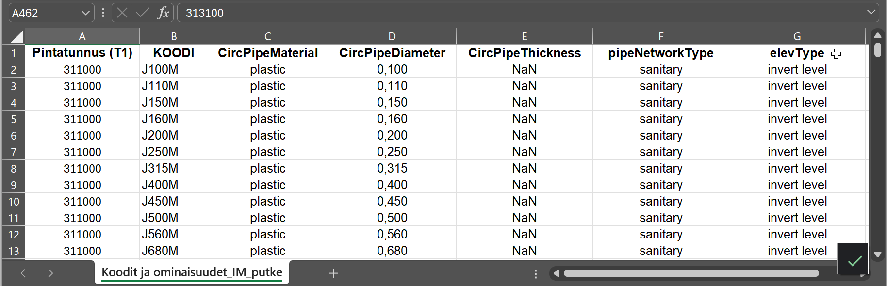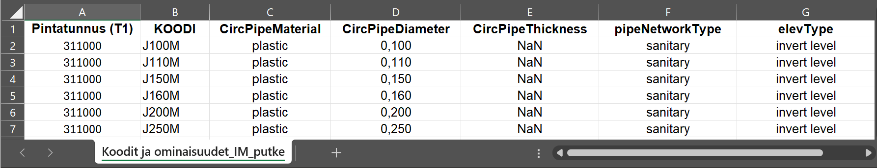 Microsoft Excel Spreadsheet InfraModel Excel Pipes.xlsx Putkityyppien ominaisuudet Inra_Rakentajakoodaus_v.2.36 koodien mukaisesti. |