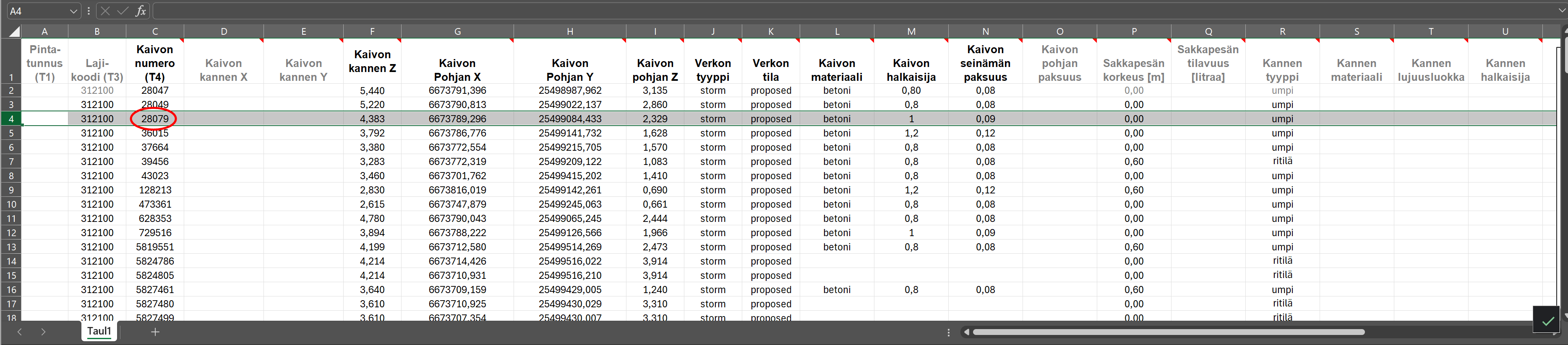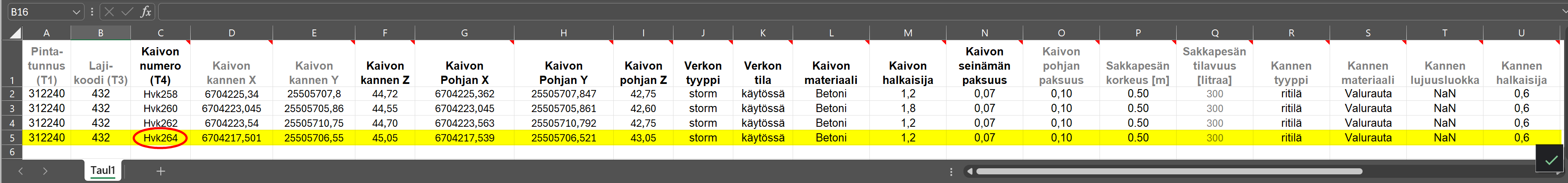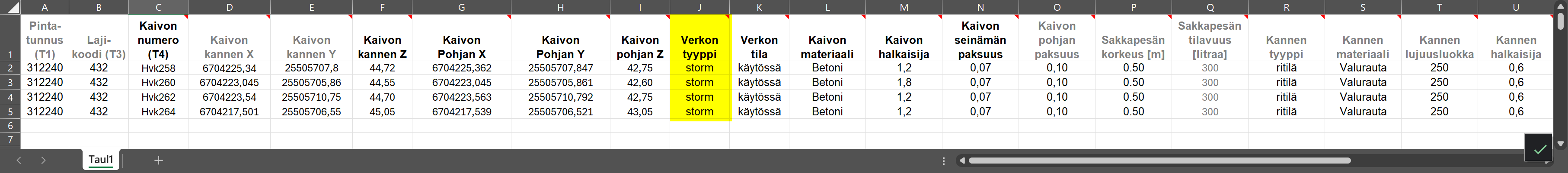 Löytyy ainoastaan Pinta, Viiva, Koodi, Tunnus sekä X,Y,Z-koordinaatit kaivon pohjalle sekä putkien viivan pisteille esimerkkinä