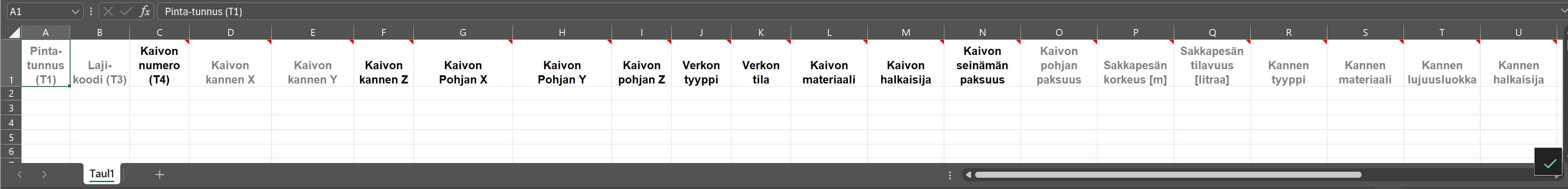 Microsoft Excel Spreadsheet InfraModel Excel Wells Template.xlsx Kaivojen ominaisuuksien hallintaan kaivon numeron (T4) mukaan. |