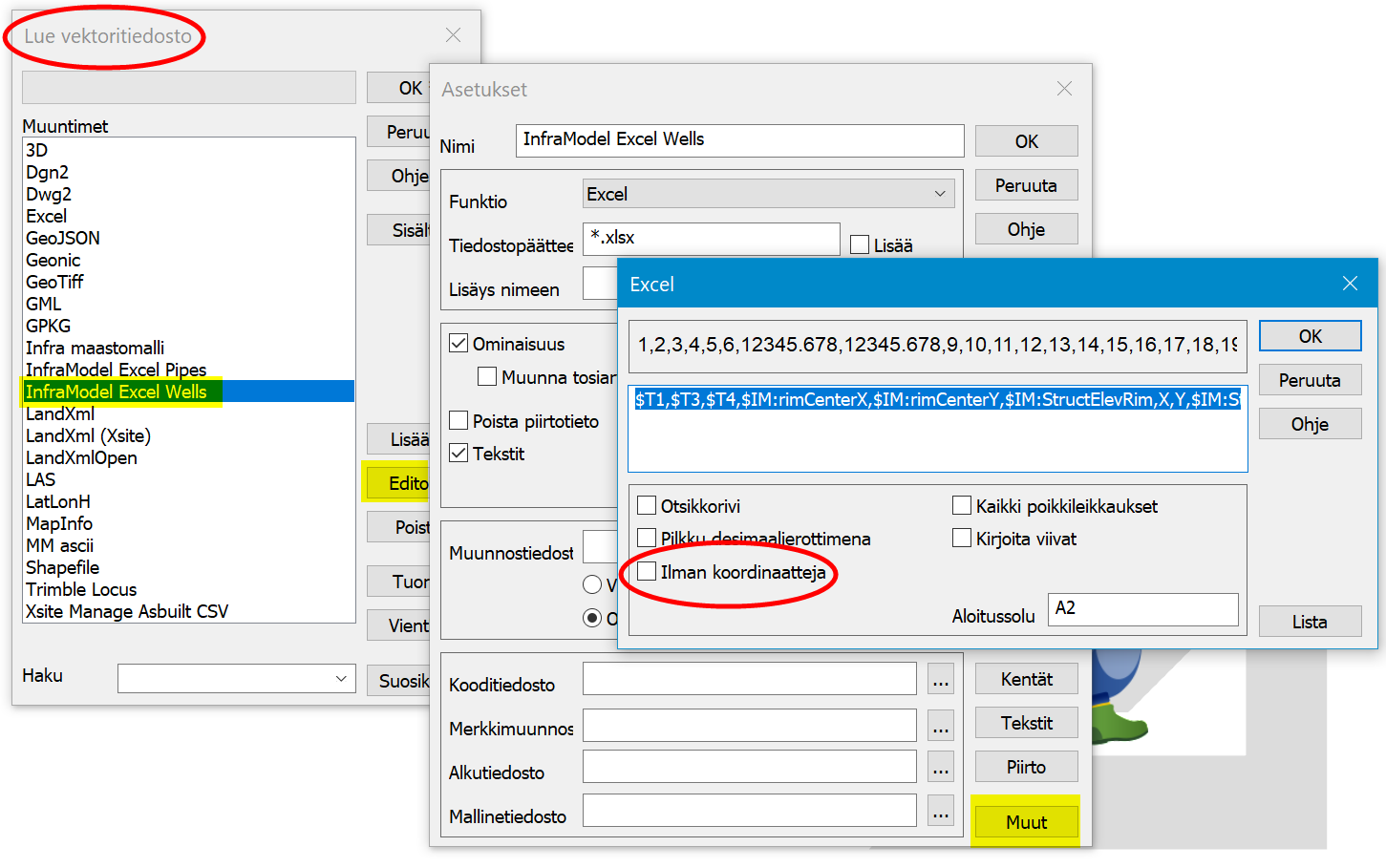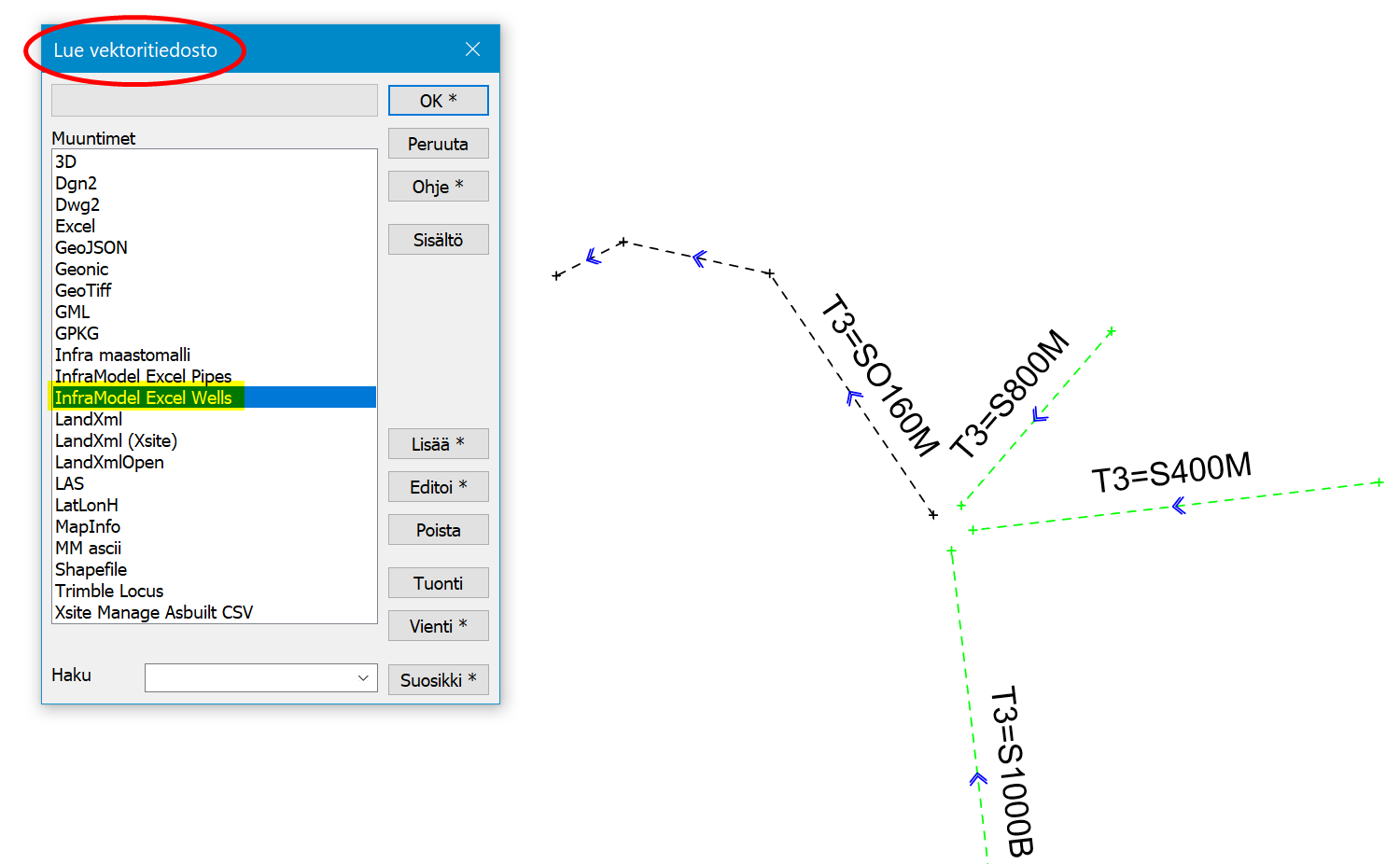 Lue kaivojen ominaisuustaulukko vektoripuolen muunninlistasta InfraModel Excel Wells -muuntimella