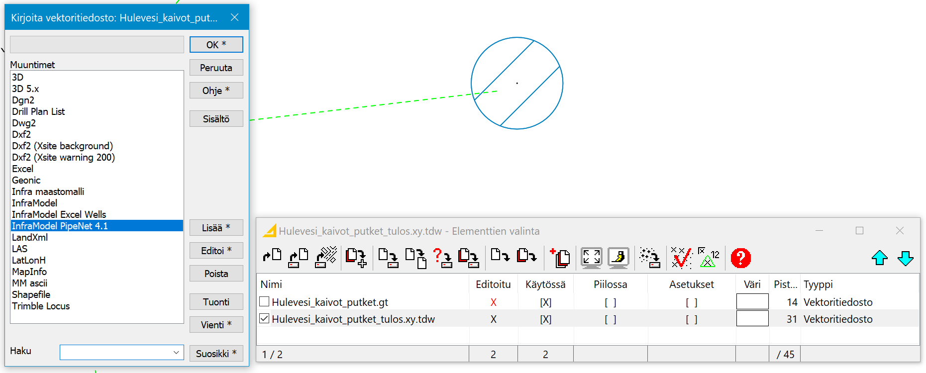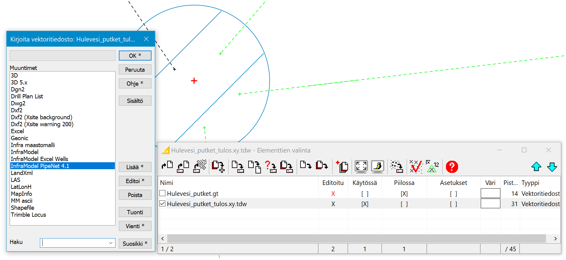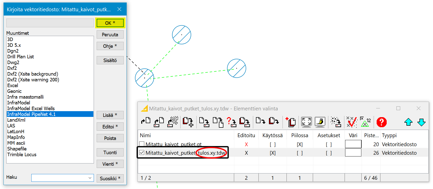 Elementtilistan aktiivinen, Putkiverkkotoiminnolla suoritettu _tulos.xy.tdw -tiedosto kirjoitetaan vektoripuolen InfraModel PipeNet 4.1 kirjoitusmuuntimella.