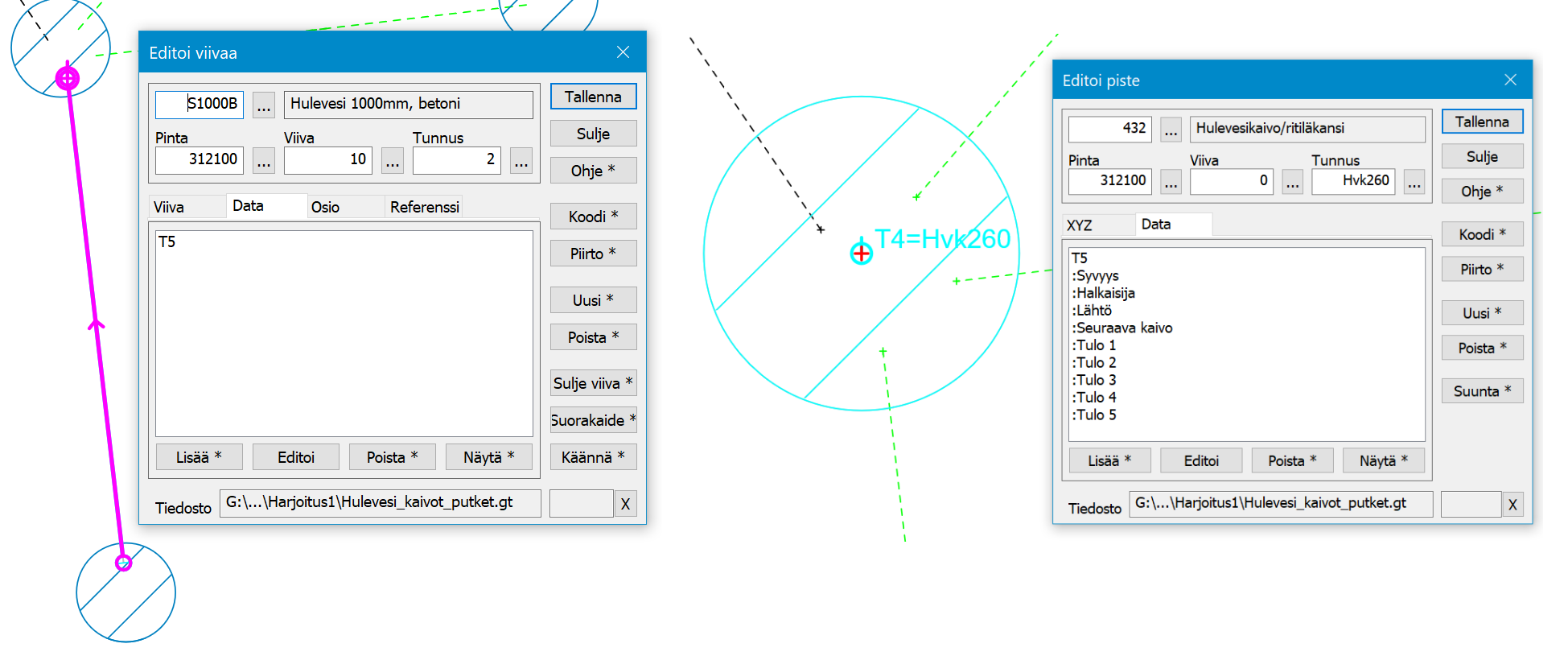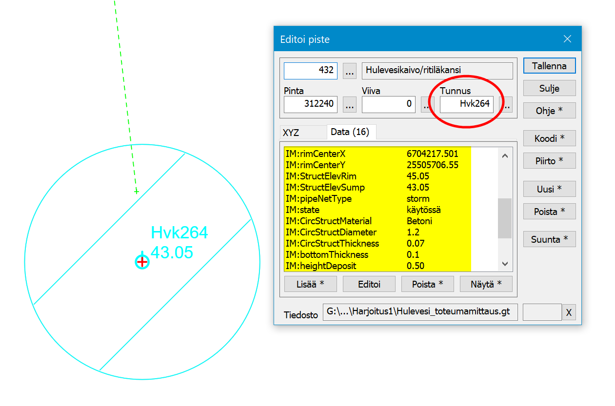 File Hulevesi_kaivot_putket.gt Esimerkki 1, mittaustiedosto, kaivon pohja ja putket |