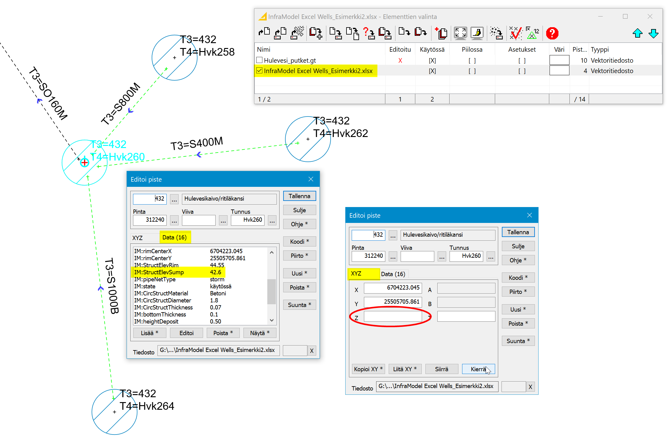 Kaivot omana tiedostonaan InfraModel Excel Wells_Esimerkki2.xlsx (ominaisuustaulukon nimi, mikä luettu).
