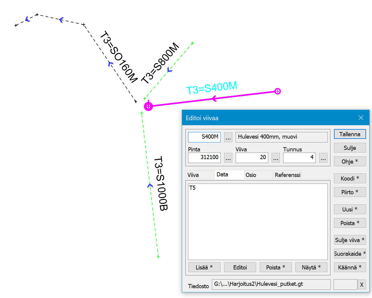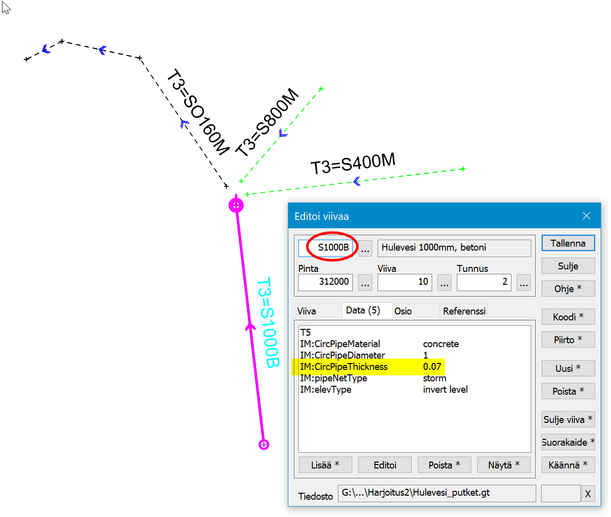 File Hulevesi_putket.gt Esimerkki 2 , mittaustiedosto, putket |