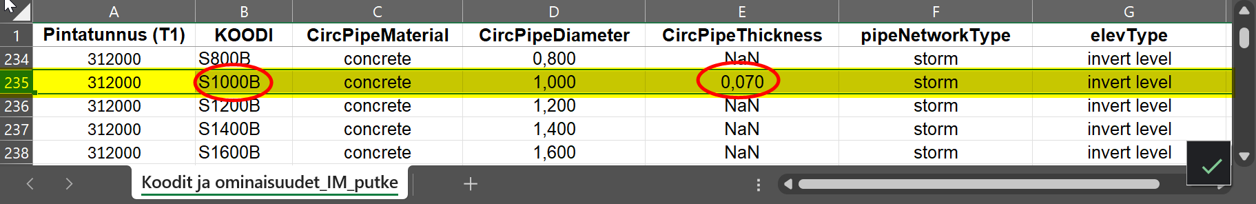 Huom. putkien seinämävahvuus CircPipeThickness arvo taulukossa on NaN