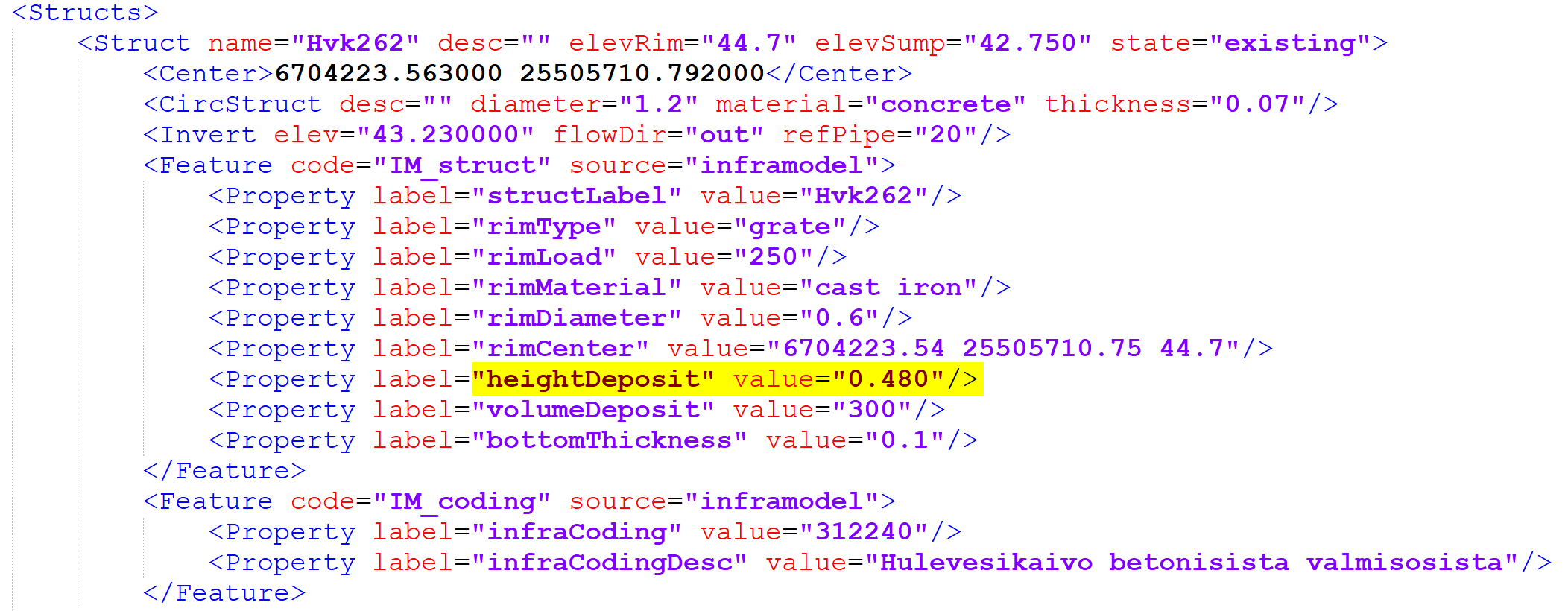 Kaivon pohjan ominaisuus IM:StructElevSump on tulostiedostossa kopioitu Z-koordinaattiin.