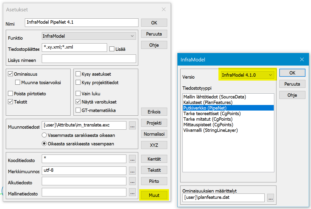 InfraModel PipeNet 4.1 kirjoitusmuuntimen asetukset (tiedoksi, käyttäjän ei tarvitse muuttaa)