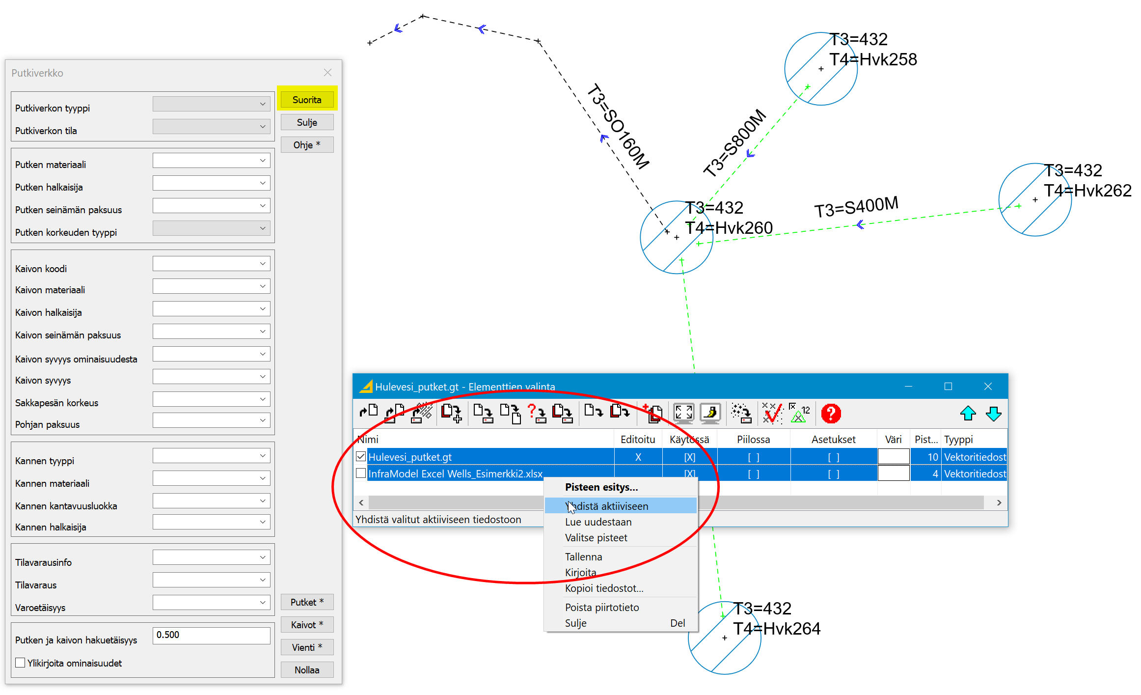 Kun ominaisuudet on haettu sekä kaivoille että putkille, voidaan suorittaa Putkiverkkotoiminto, joka linkittää objektit Inframodel-standardin mukaisesti. HUOM. Kaivot ja putket oltava samassa tiedostossa.