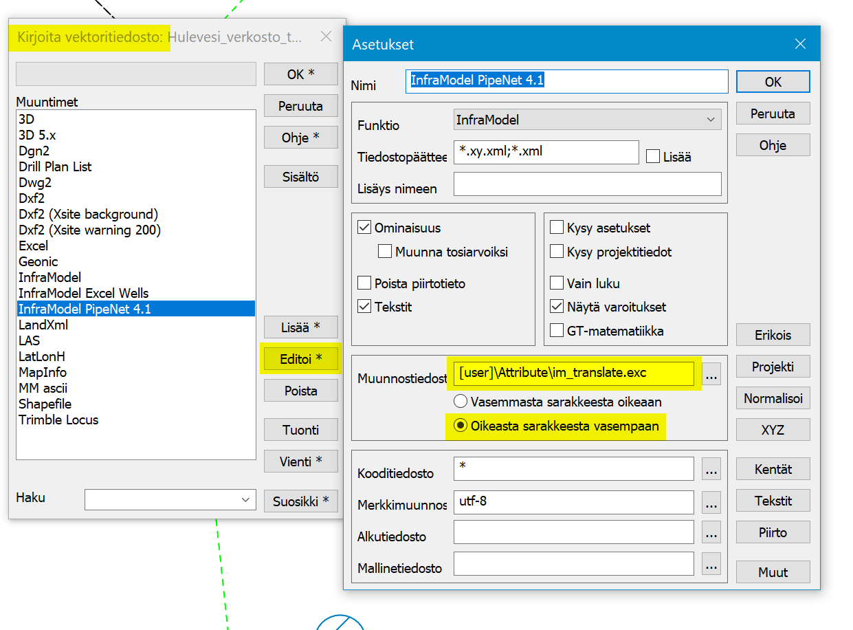 Kielikäännös on lisätty oletuksena InfraModel PipeNet 4.1 kirjoitusmuuntimen asetuksiin. Muunnostiedosto im_translate.exc luetaan käyttäjähakemiston Attribute-kansiosta. Oikeasta sarakkeesta vasempaan.