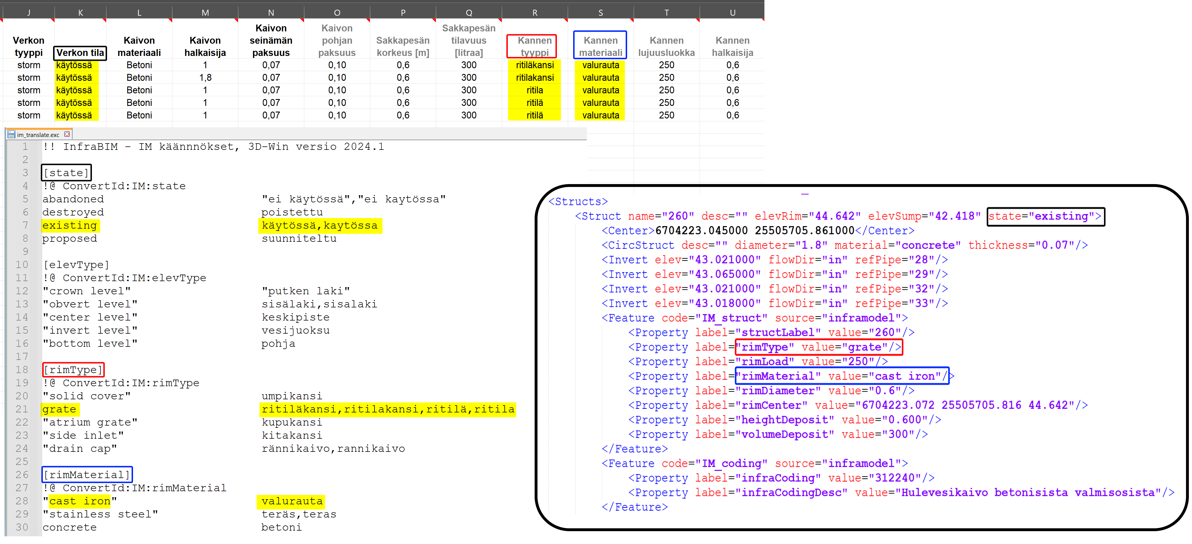 Muunnostiedosto im_translate.exc kääntää putkien ja kaivojen suomenkieliset ominaisuuksien arvot virallisiin englanninkielisiin. Tämä mahdollistaa putkien ja kaivojen ominaisuustaulukoissa suomenkieliset arvot. Poislukien Verkon tyyppi, IM:pipeNetType on oltava Excel-taulukossa englanniksi!