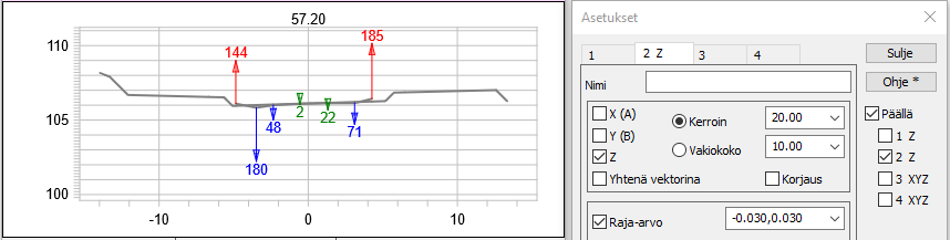 Kuvassa tarkkeet kertoimella 20, Asemointi=0 ja arvot millimetreinä. Toleranssina -30mm, 30 mm. Poikkileikkausikkunan tarkkeiden esitystapa valitaan kohdassa Asetukset – Tarkemittaukset.