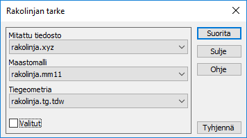Laskee rakolinjan tarkkeet annettuun maastomalliin nähden käyttäen TG-tiedostoa, joka määrää tarkkeen suunnan. Jokaiselle mitatulle pisteelle haetaan TG-tiedostosta paaluluku ja tältä kohdalta lasketaan poikkileikkaus maastomallista. Tarkemitta on mitatun pisteen lyhin etäisyys laskettuun poikkileikkaukseen.