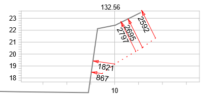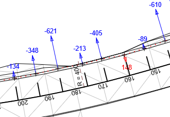 Samaan poikkarikuvaan voi tulla useita tarkkeita, jos hakuetäisyyttä kasvattaa Hae pisteet -toiminnossa. Alla olevassa kuvassa hakuetäisyys 5.0 eli kuvassa näkyvät paaluvälille 127.56 - 137.56 osuvat tarkkeet.