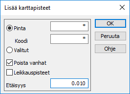Valitse Laskenta – Lisää karttapisteet. Valitse Poista vanhat ja hakuetäisyys riittävän pieni, jotta vain tällä kohdalla mitatut pisteet tulvat näkyviin.