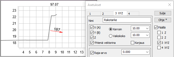 Tarkkeiden asetukset löytyvät kohdasta Asetukset – Tarkemittaukset. Jos Käytä Z-etumerkkiä -rasti on päällä, virheen etumerkki haetaan Z-komponentista. Tällöin toleranssilla 0.000 tarkeen väri vaihtuu sen mukaan ollaanko pinnan ylä- vai alapuolella eli onko louhinta jäänyt vajaaksi.