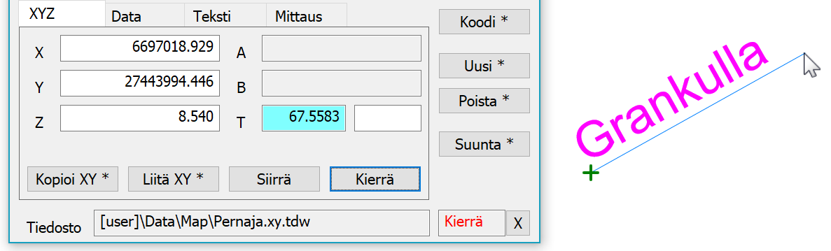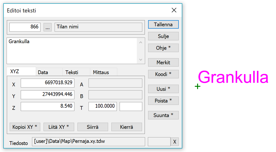 Ensimmäisellä XYZ-välilehdellä on tekstin geometriaan liittyvät asiat kuten koordinaatit ja suuntakulma T-kentässä. A- ja B-kentät ovat käytössä poikki- ja pituusleikkausten teksteissä. Koordinaattien Kopioi- ja Liitä-painikkeet toimivat kuten pisteen editoinnissa. Siirrä-painikkeen aktivoimassa siirtotilassa osoitetaan tekstin referenssipisteen paikka ja Kierrä-painikkeen kiertotilassa tekstin suunta. Kiertotilassa näytetään myös katkoviiva referenssipisteestä hiiren sijaintiin. Suunta-painikkeella voidaan editoitavan tekstin suuntaa kääntää vakioaskelin samalla tavalla kuin pisteen symbolin suuntaa.