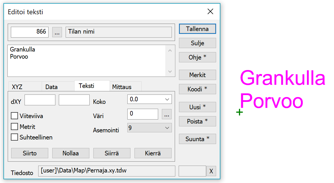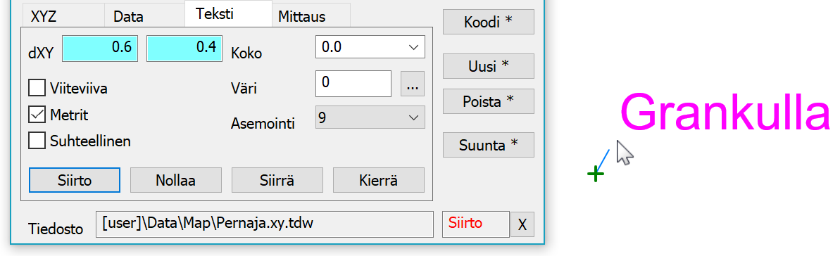Teksti-välilehdeltä löytyvät tekstin ulkoasuun vaikuttavat asiat. Koko ja väri voidaan antaa täällä tekstikohtaisesti. Jos ne ovat nollia, käytetään kooditiedoston fonttimäärittelyn arvoja. Jos fonttimäärittelyäkään ei löydy, käytetään pisteen esityksen kokoasetusta ja mustaa väriä. Siirrä- ja Kierrä-painikkeet ovat samat kuin XYZ-välilehdellä.