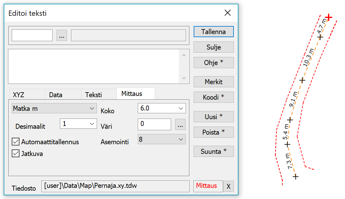 Oletuksena luodaan mittateksti kahden osoitetun pisteen välille ja se on tallennettava erikseen. Automaattitallennus-asetus tallentaa tekstin automaattisesti osoittamisen jälkeen. Jatkuva-asetuksella toiminto muistaa edellisen pisteen ja laskee mitan siitä osoitettuun pisteeseen. Tämä toimii erityisesti Taiteviiva-hakutavan kanssa, jolloin mitat lasketaan osoitetun viivan kaikille pisteväleille.