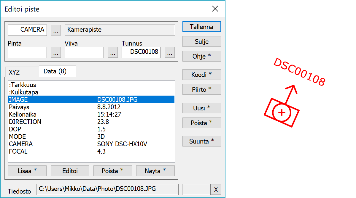 Liitetiedoston ominaisuuden nimi annetaan asetuksissa. Vastaavasti voidaan valita tallennetaanko pelkkä kuvan nimi vai koko hakupolku. Jos kuvasta löytyy kompassisuunta, se laitetaan symbolin suunnaksi. Oletuksena piste saa T3-lajikoodin CAMERA, mutta se voidaan halutessa vaihtaa muuntimen koodiasetuksissa. Pisteen T4 kentän arvoksi tulee suoraan luetun kuvan nimi ilman päätettä.